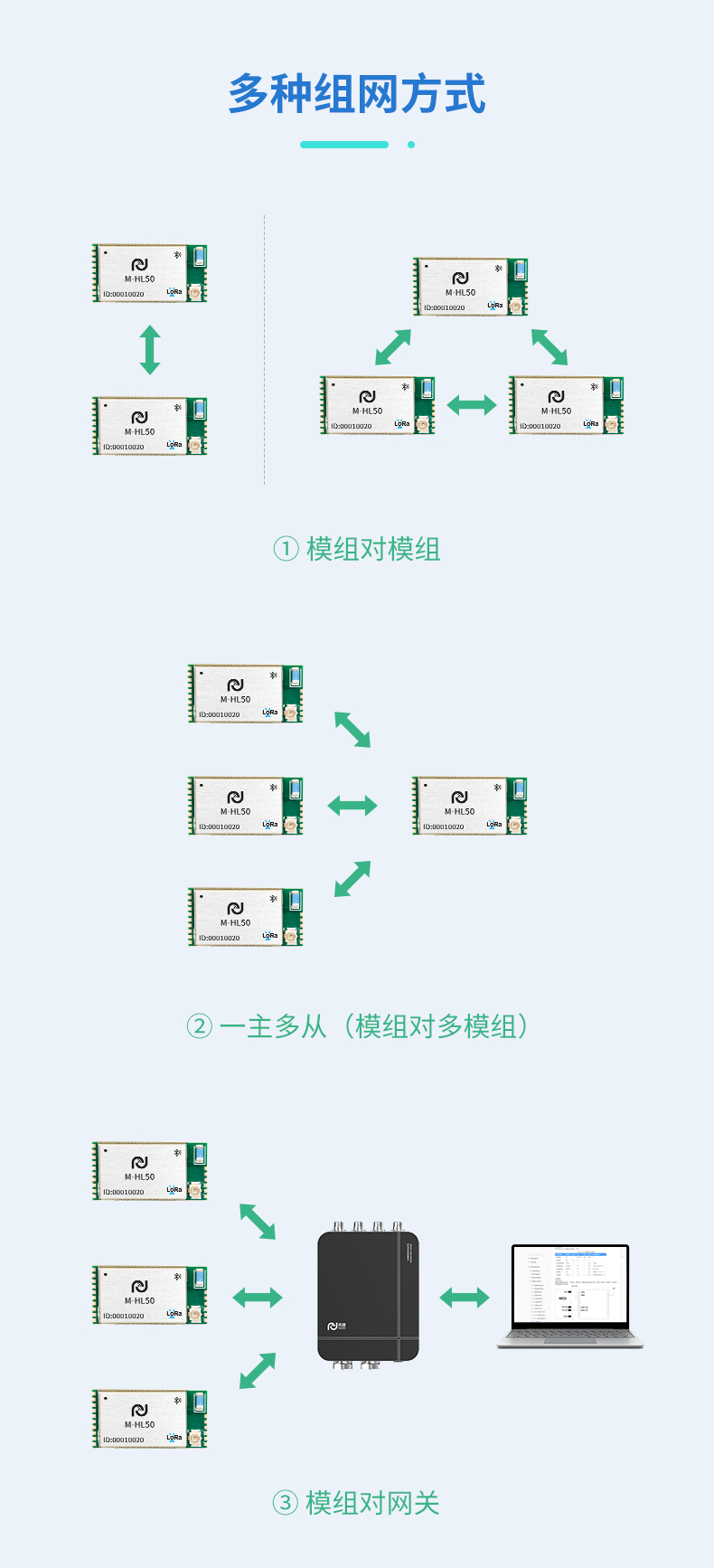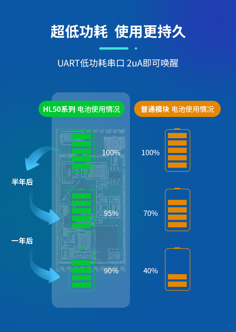 M-HL50是一系列针对低功耗远距离物联网应用设计的超低功耗LoRa+BLE终端透传模组,集成高性能工业级LoRa芯片SX1268 / SX1262及低功耗蓝牙功能。休眠功耗低至10uA(开启蓝牙广播功能),供电范围支持2.2-3.6V,是电池供电物联网应用的优选方案。支持多种工作模式、支持AT指令配置、支持蓝牙透传/配置/升级、支持手机小程序查看/配置。出厂默认LoRa透传固件,提供二次开发资源包。