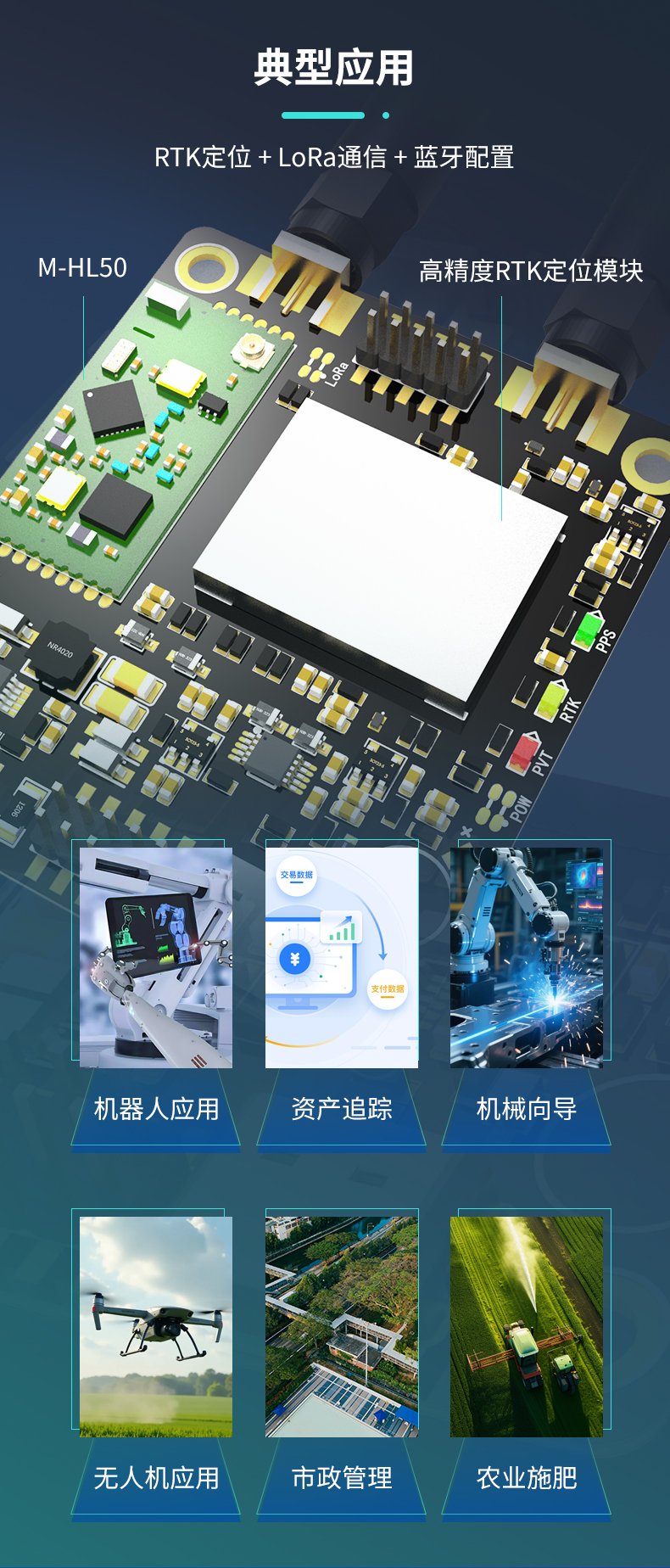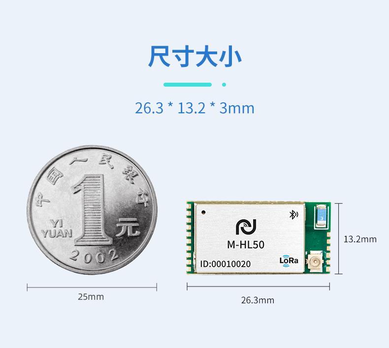 M-HL50尺寸为26.3mm * 13.2mm * 3mm,带屏蔽罩,采用邮票孔封装,天线同时支持邮票孔出线 / I-PEX接口。