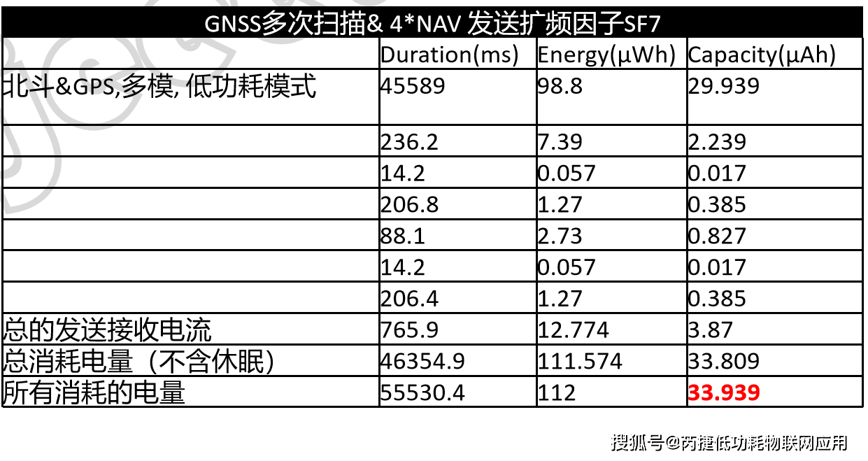 执行 GNSS scan 命令并通过 LoRaWAN 上传结果。这里做了 4 次扫描。年消耗功耗:33.939*24*365*12(5分钟一次)=3,567,667uAh=3567mAh。一节19Ah的ER34615电池可以使用5年。